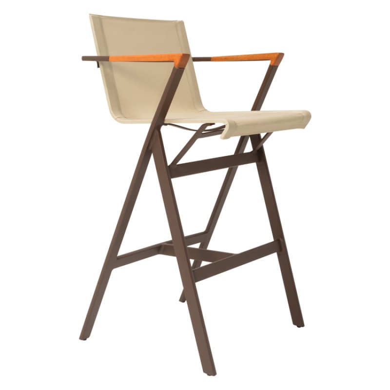 A estrutura em alumínio oferece alta resistência à corrosão e facilidade de manutenção, enquanto os detalhes em madeira teca acrescentam um toque natural e refinado, valorizando o design contemporâneo da peça. O assento em tela sling proporciona conforto térmico e durabilidade, tornando esta banqueta uma escolha versátil e funcional.