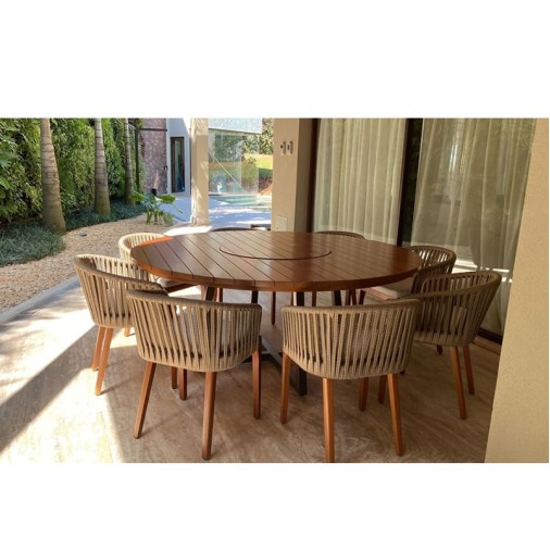 A madeira Cumarú, proveniente de reflorestamento, confere à cadeira resistência e durabilidade, suportando as intempéries com elegância. O trançado artesanal da corda náutica adiciona um toque de sofisticação e personalidade à peça. Os pés em madeira maciça garantem estabilidade e complementam o design com um toque natural.