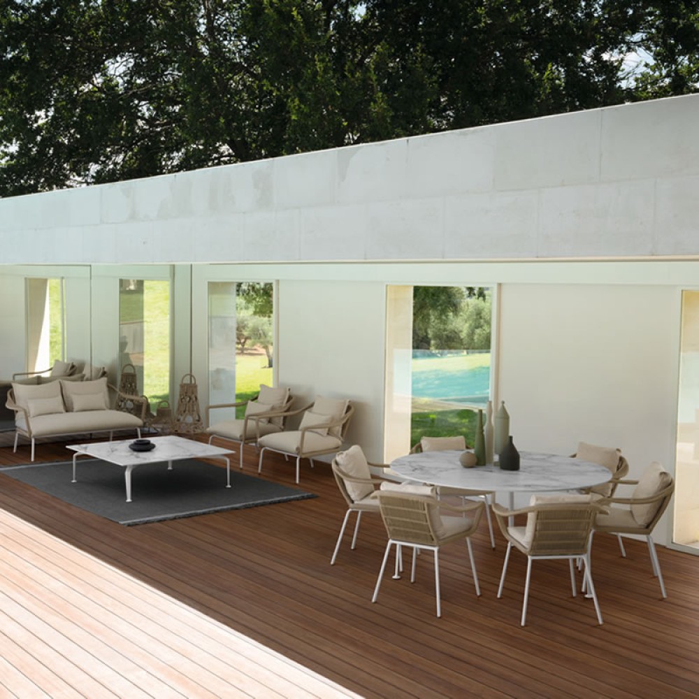 Cadeira para ambiente externo, estrutura em alumínio recoberto por pintura eletrostática, trama em corda náutica e almofadas removíveis em tecido impermeável oferecendo grande conforto ao sentar. Ideal para ser utilizada em sua varanda, piscina, jardim ou até mesmo sua área interna.