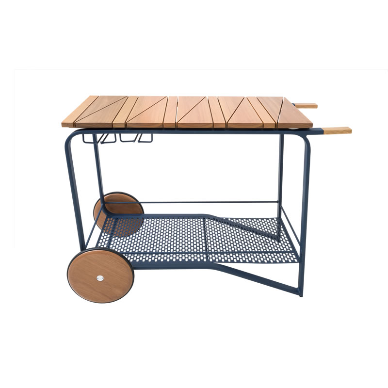 A estrutura em alumínio com pintura eletrostática garante leveza e durabilidade, resistente à umidade e ao tempo. O tampo em madeira teca valoriza o design com sua textura natural e calor visual, enquanto as rodas do mesmo material oferecem mobilidade com um toque artesanal. O resultado é uma peça prática, sofisticada e versátil.