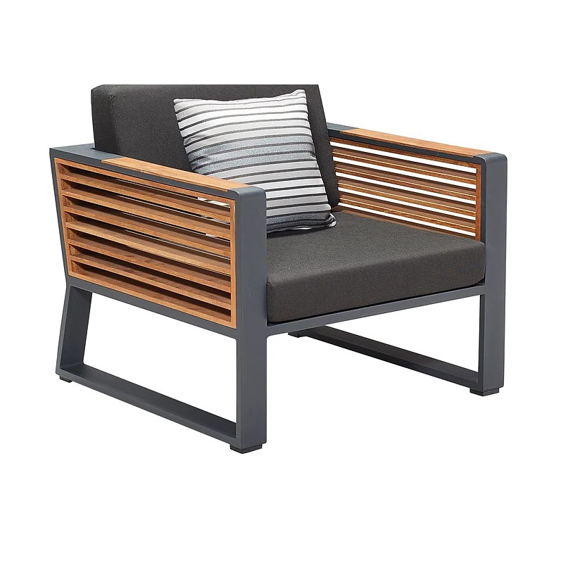 A estrutura em alumínio com pintura eletrostática garante durabilidade e resistência às intempéries, enquanto os detalhes em madeira Cumarú, proveniente de reflorestamento, adicionam um toque de elegância e sofisticação. As almofadas removíveis, confeccionadas em tecido impermeável de alta qualidade, proporcionam conforto incomparável e facilitam a manutenção. O tampo da mesa de centro em madeira Cumarú completa o conjunto com um toque natural e refinado.