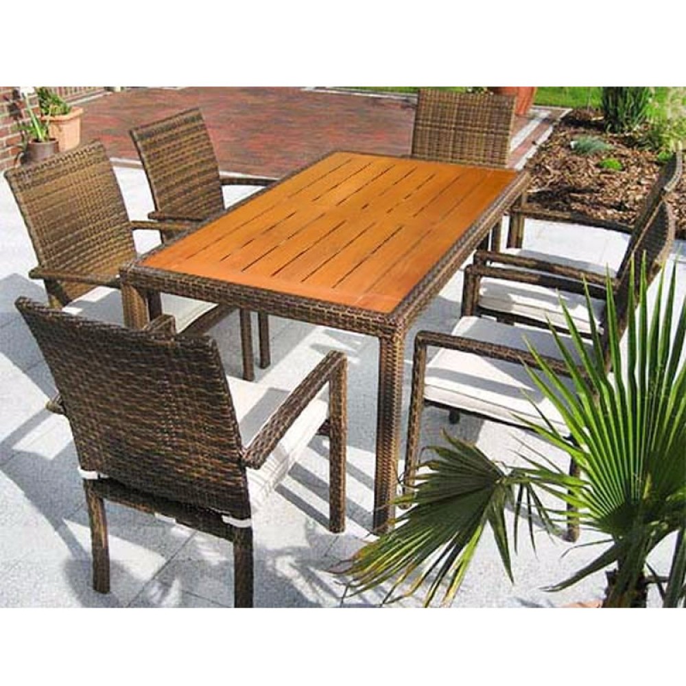 O conjunto é composto por 6 cadeiras com braço e uma mesa com tampo de madeira Cúmaru.