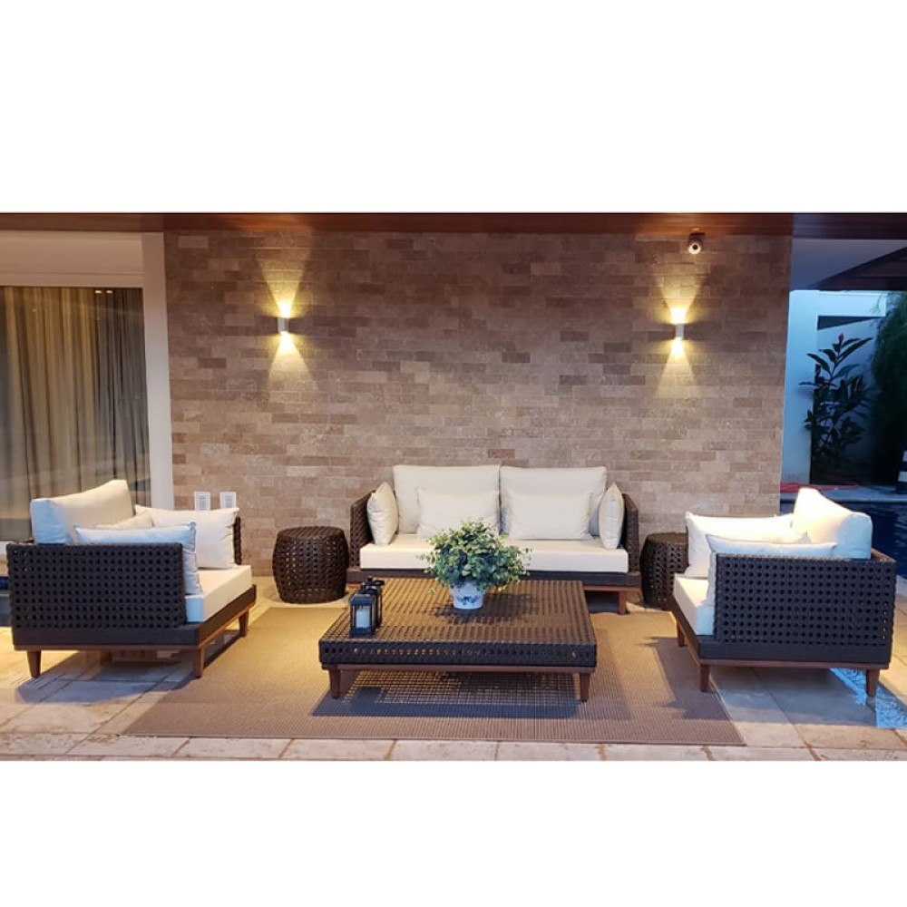 Conjunto para ambiente externo, estrutura em alumínio recoberto por pintura eletrostática, trama em fibra sintética e almofadas removíveis em tecido impermeável oferecendo grande conforto ao sentar. Ideal para ser utilizada em sua varanda, piscina, jardim ou até mesmo sua área interna.