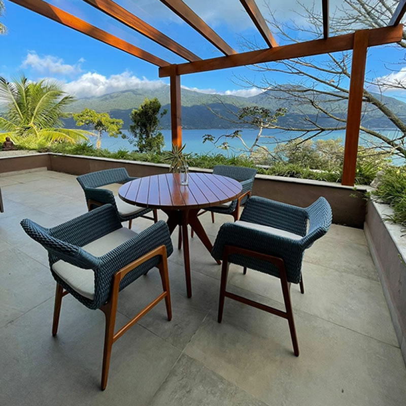 Desfrute de momentos inesquecíveis com o Conjunto Nascente. Com design elegante e atemporal, este conjunto de jantar combina a beleza natural da madeira cumaru com a sofisticação da corda náutica, criando uma atmosfera acolhedora e requintada em seu espaço gourmet.