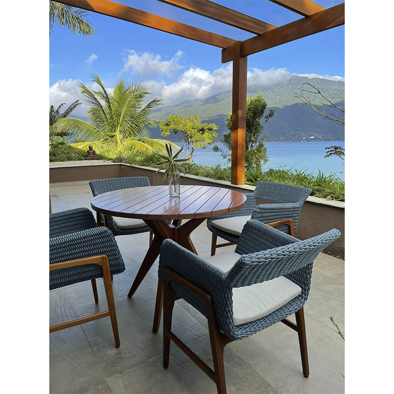 A mesa redonda, com tampo em madeira cumaru, oferece um toque de rusticidade e elegância, enquanto as cadeiras Lille, com estrutura em madeira e assento em corda náutica trançada, proporcionam conforto e estilo. O acabamento impecável e os materiais de alta qualidade garantem durabilidade e sofisticação para seu ambiente.