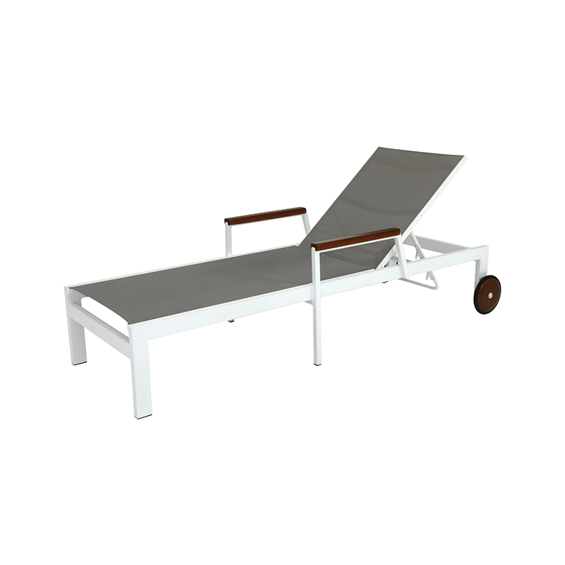 O diferencial desta peça está no braço e rodas com detalhes em madeira teca, que conferem um toque de sofisticação natural e acolhedor, além das rodas traseiras, que facilitam a movimentação da espreguiçadeira, permitindo ajustes simples e práticos para acompanhar a posição do sol ou para reorganizar seu espaço com facilidade.