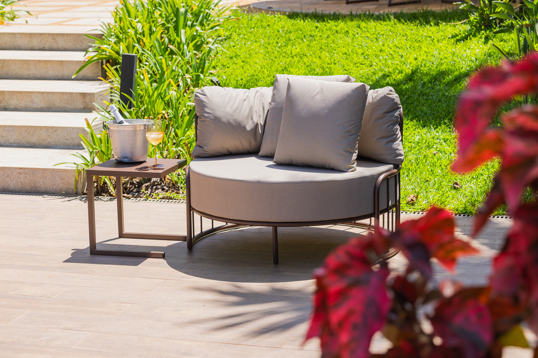 Cada detalhe é pensado para que a poltrona acompanhe sua rotina: a madeira mantém seu calor e charme, o alumínio resiste às intempéries, a corda náutica e a fibra sintética oferecem firmeza e leveza, e o tecido Acquablock suporta o uso ao ar livre sem perder maciez ou cor.