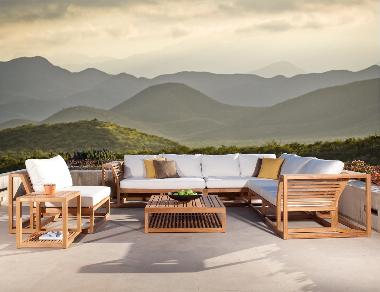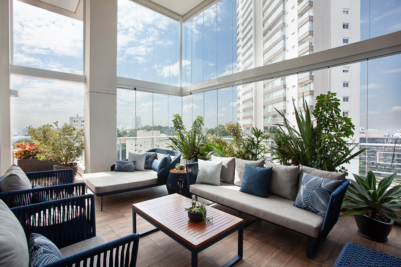 A madeira traz presença e naturalidade, funcionando como elemento de ancoragem visual. O alumínio, com linhas precisas, confere leveza e modernidade. Tampos em vidro ampliam a sensação de espaço, enquanto combinações com fibra sintética ou detalhes estruturais equilibram resistência e sofisticação — especialmente em áreas externas.