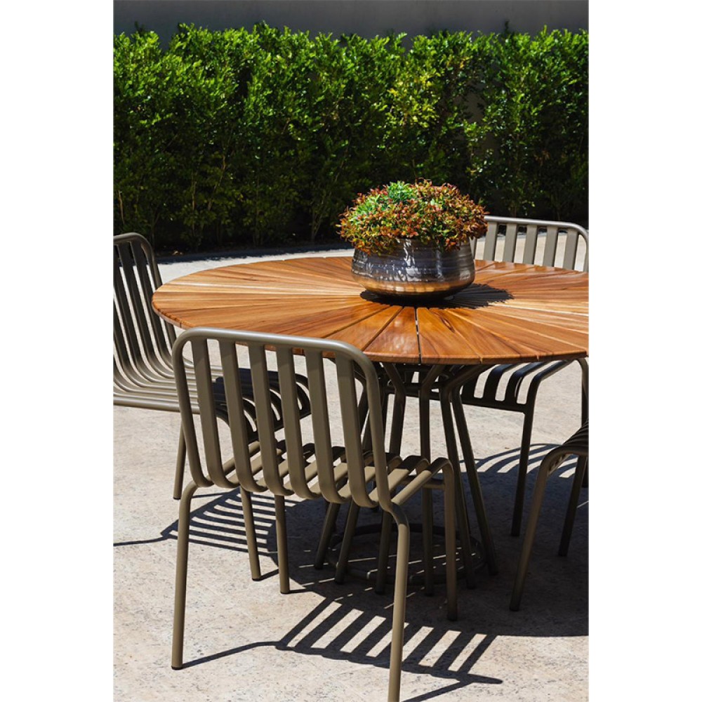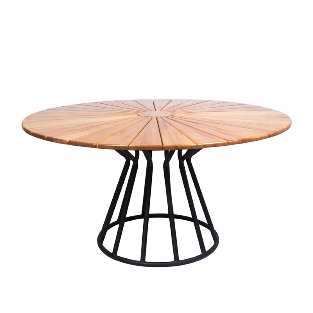 MESA DE JANTAR REDONDA EM ALUMÍNIO TURQUESA COM TAMPO EM MADEIRA CUMARU