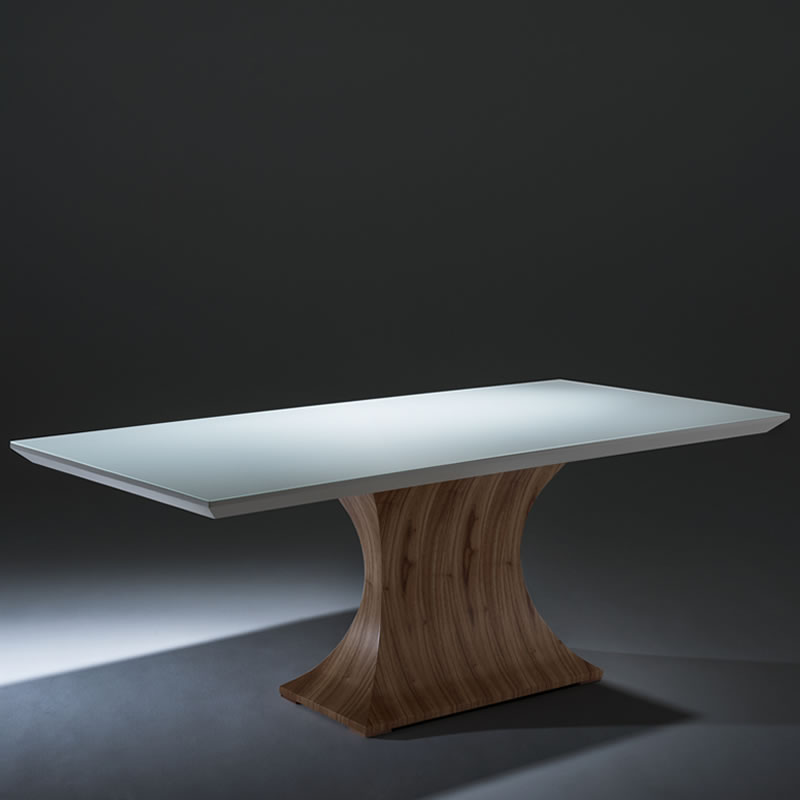 Mais Informações Base em 4 peças de compensado curvo multilaminado. Base: Madeira ou laca - Tampo: laca com vidro 4mm pintado