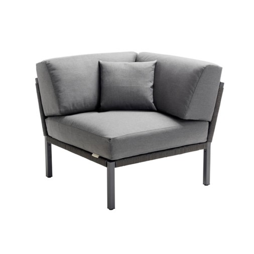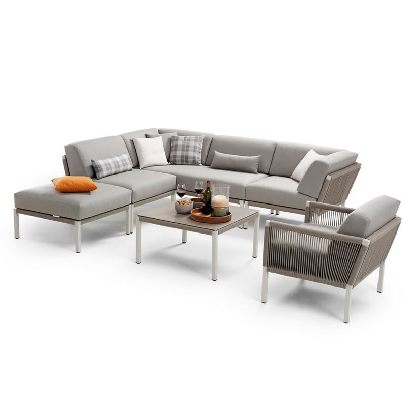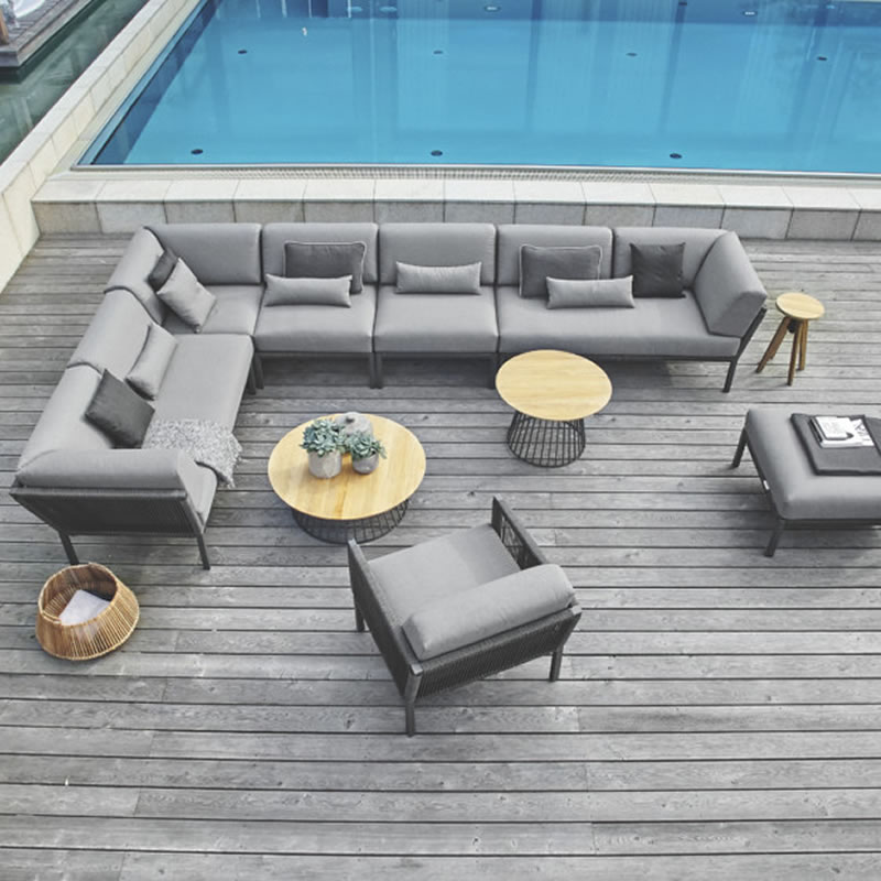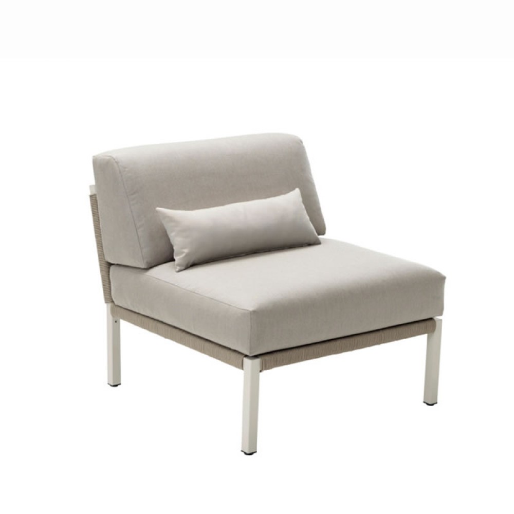 Módulo central para ambiente externo, estrutura em alumínio recoberto por pintura eletrostática, trama em corda náutica e almofadas removíveis em tecido impermeável oferecendo grande conforto ao sentar. Ideal para ser utilizada em sua varanda, piscina, jardim ou até mesmo sua área interna.
