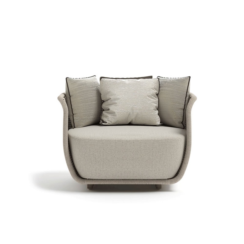 Poltrona para ambiente externo, estrutura em alumínio recoberto por pintura eletrostática, trama em corda náutica e almofadas removíveis em tecido impermeável oferecendo grande conforto ao sentar. Ideal para ser utilizada em sua varanda, piscina, jardim ou até mesmo sua área interna.