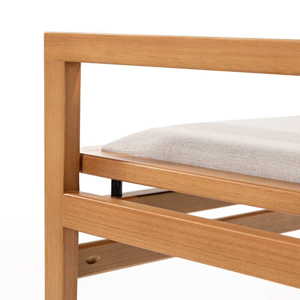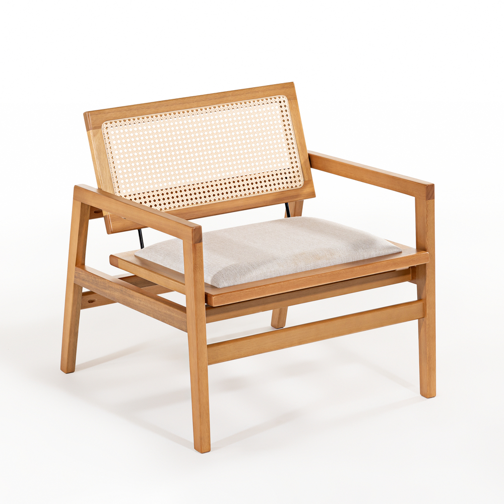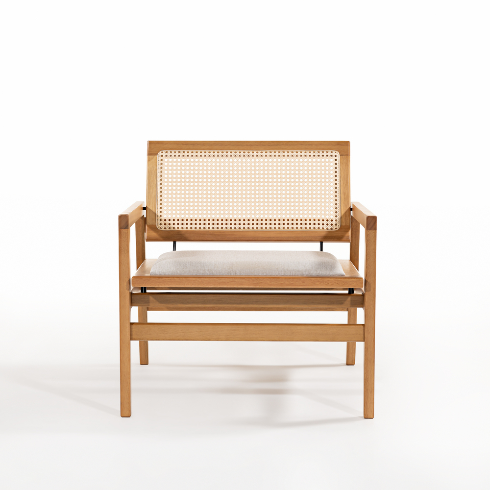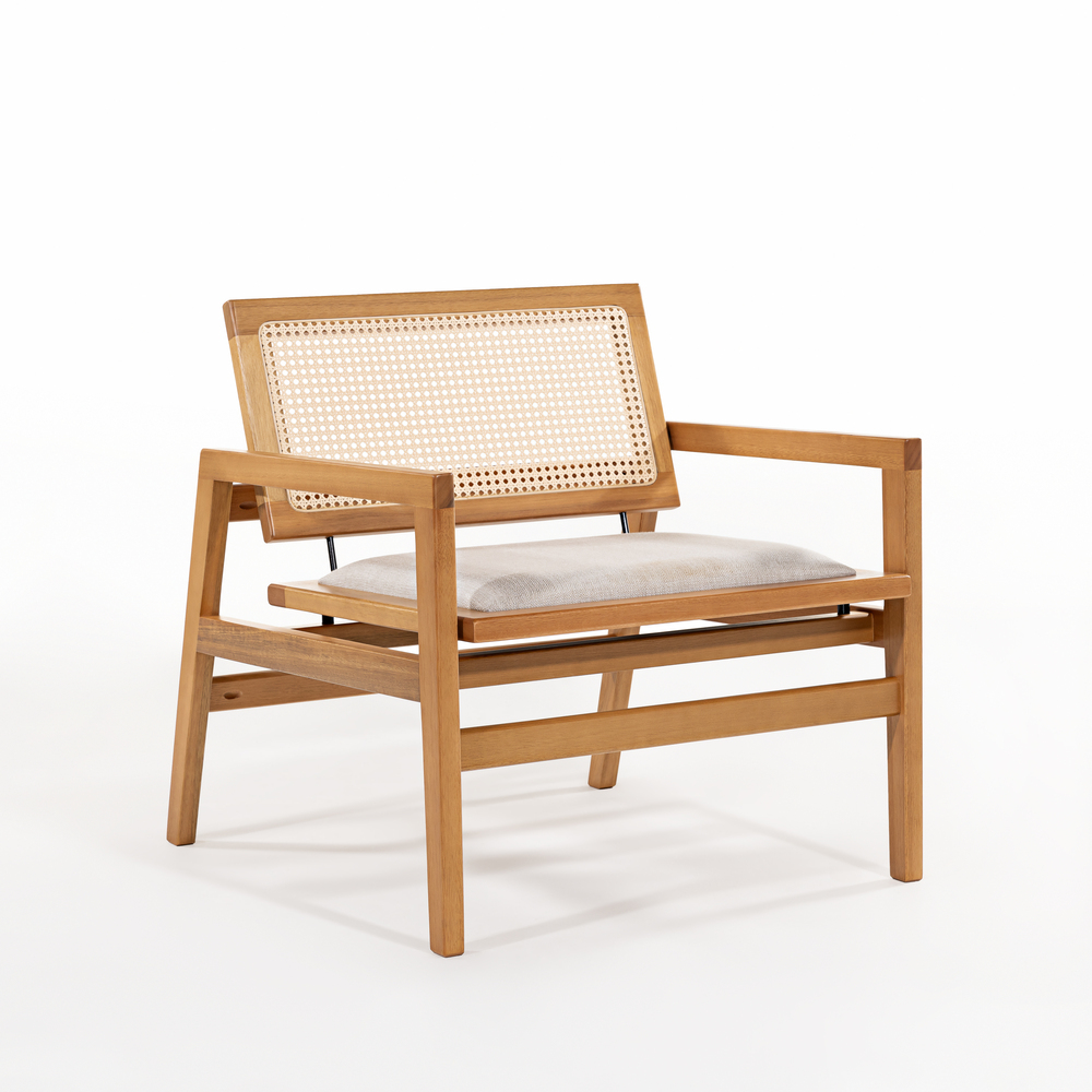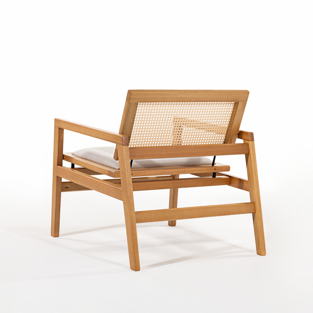 A Poltrona Alba é a união perfeita entre design atemporal e aconchego. Produzida em madeira maciça de alta qualidade, seu visual ganha um toque sofisticado com o acabamento em verniz, que realça os veios naturais e protege a estrutura contra desgastes do tempo. O design com braços oferece apoio ergonômico, enquanto o assento estofado de densidade confortável convida a momentos de relaxamento e bem-estar, seja em áreas internas ou externas cobertas.