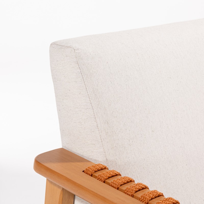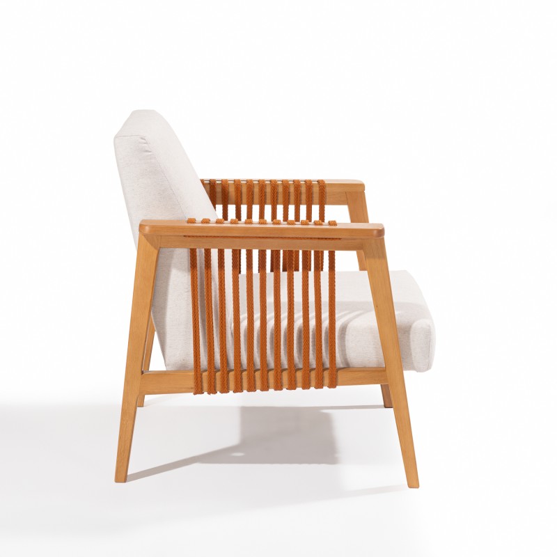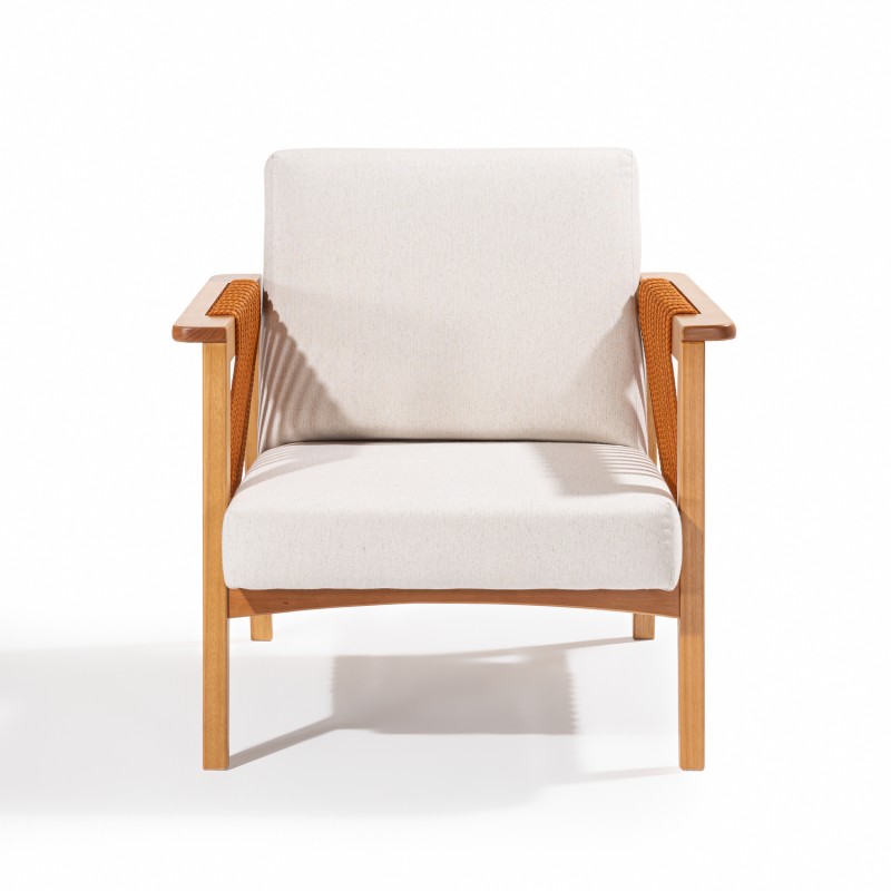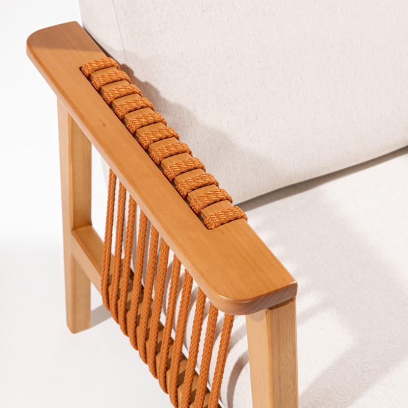 A Poltrona Gaia é a expressão do equilíbrio entre natureza e design contemporâneo. Estruturada em madeira de eucalipto de alta qualidade, com acabamento em verniz que realça sua tonalidade natural, ela ganha ainda mais personalidade com o elegante detalhe em corda náutica tramada à mão, que confere leveza visual e autenticidade artesanal.