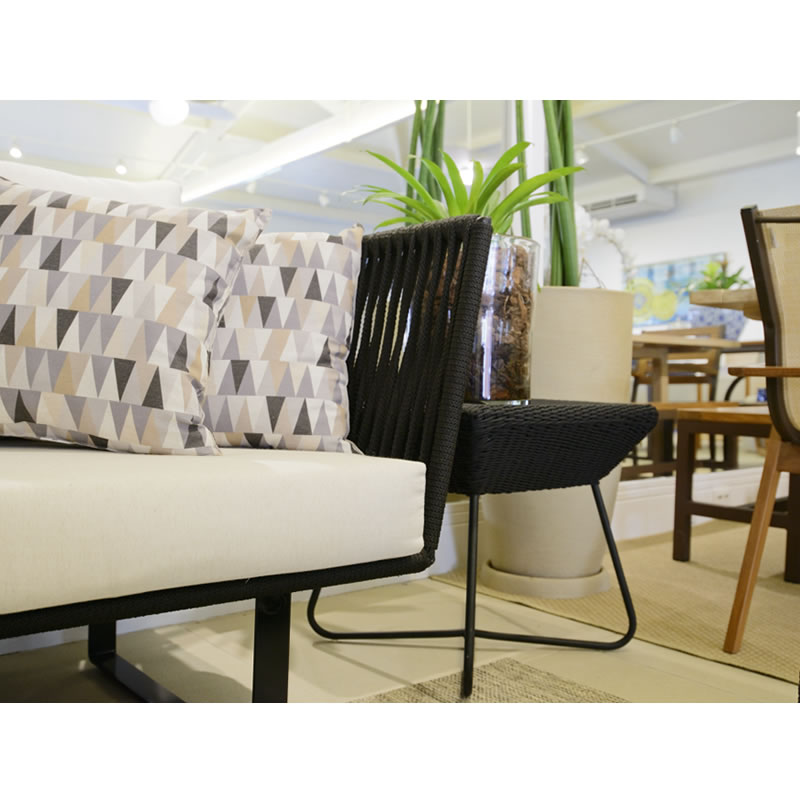 Sua estrutura em alumínio com pintura eletrostática garante leveza, resistência e durabilidade, enquanto a trama artesanal em corda náutica adiciona um toque de requinte e aconchego. As almofadas, confeccionadas em tecido impermeável de alta performance, proporcionam o máximo conforto e são facilmente removíveis para limpeza. Para preservar a beleza e a qualidade das almofadas, lembre-se de protegê-las da chuva.