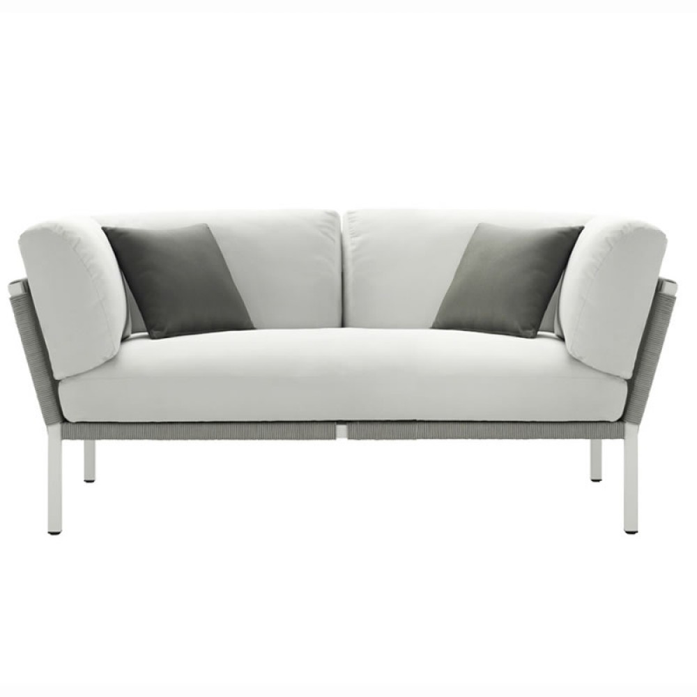 Sofá para ambiente externo, estrutura em alumínio recoberto por pintura eletrostática, trama em corda náutica e almofadas removíveis em tecido impermeável oferecendo grande conforto ao sentar. Ideal para ser utilizada em sua varanda, piscina, jardim ou até mesmo sua área interna.